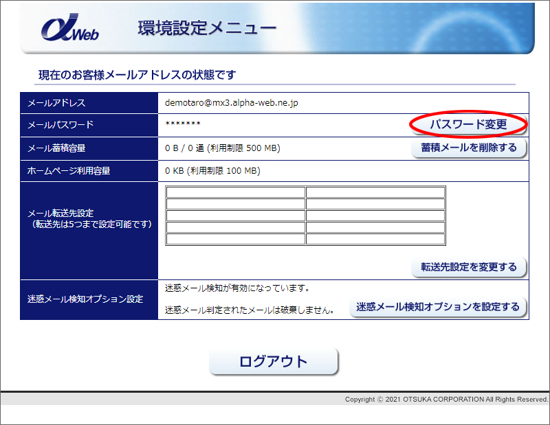 メールパスワードを変更します。変更後のメールパスワードは必ずお手元にお控えください。