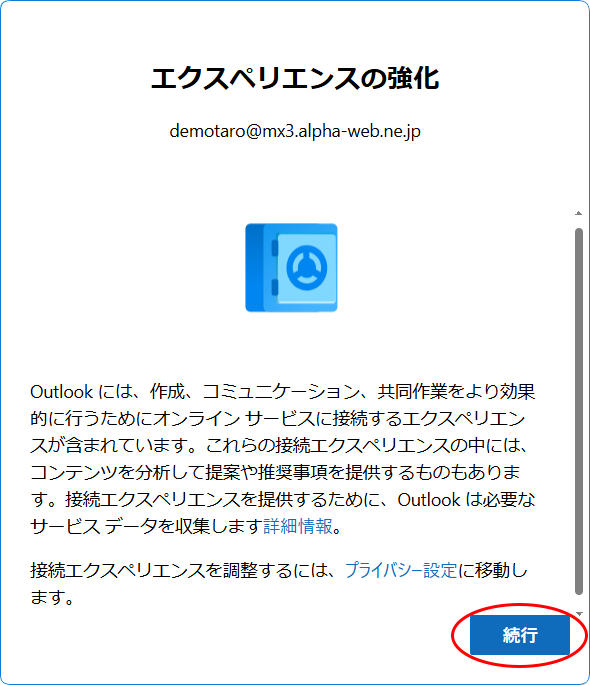 オプションデータをMicrosoftに「送信します」または「送信しません」を選択し、「承諾」をクリックします。