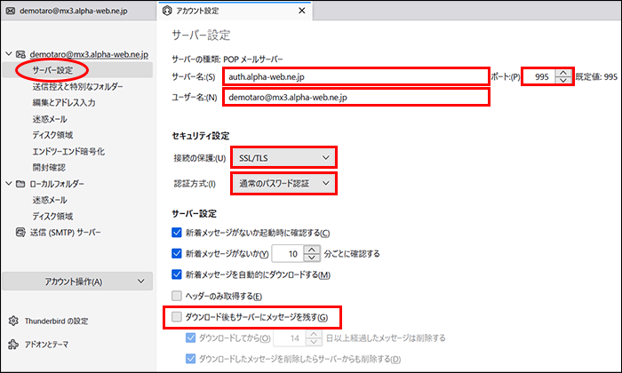 サーバー名 「auth.alpha-web.ne.jp」と、半角文字で入力します。 ポート 「995」と、半角文字で入力します。 ユーザー名 メールアドレスを、半角文字で入力します。 接続の保護 「SSL/TLS」を選択します。 認証方式 「通常のパスワード認証」を選択します。 ダウンロード後もサーバーにメッセージを残す チェックしません(推奨)。